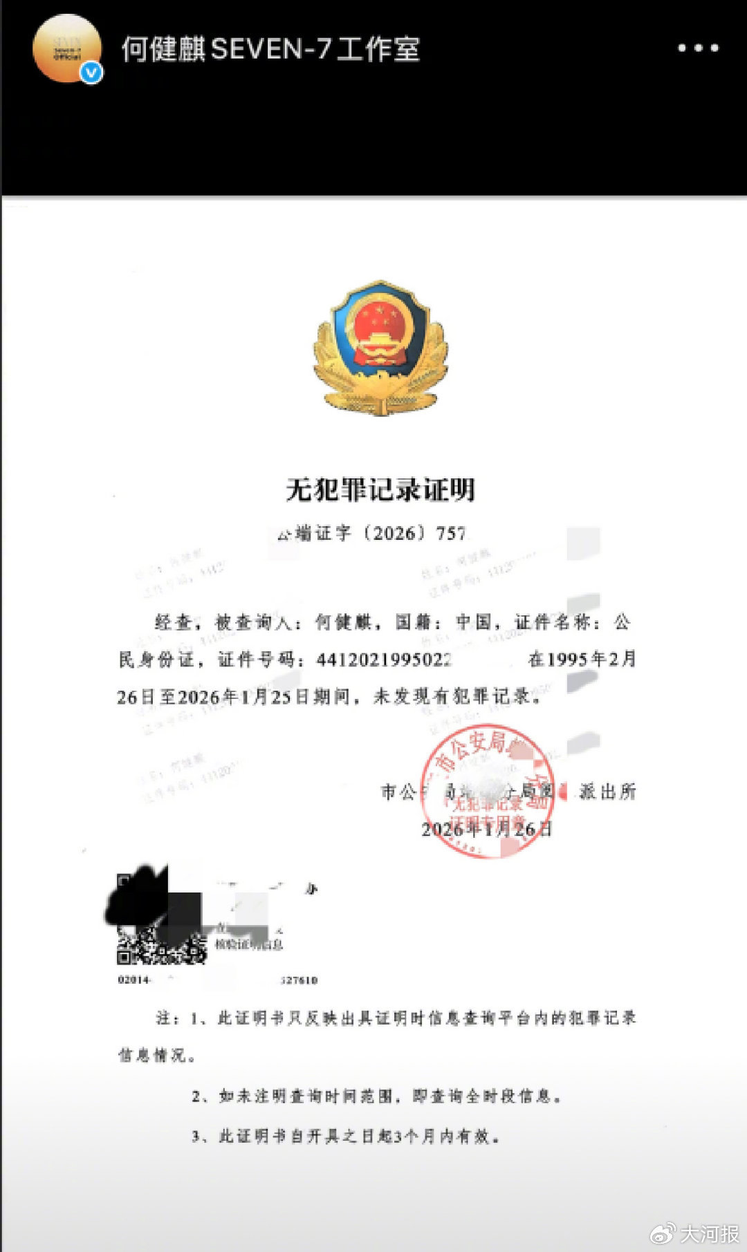 1月27日,何健麒工作室亮出落款并盖章为某派出所的无犯罪记录证明。