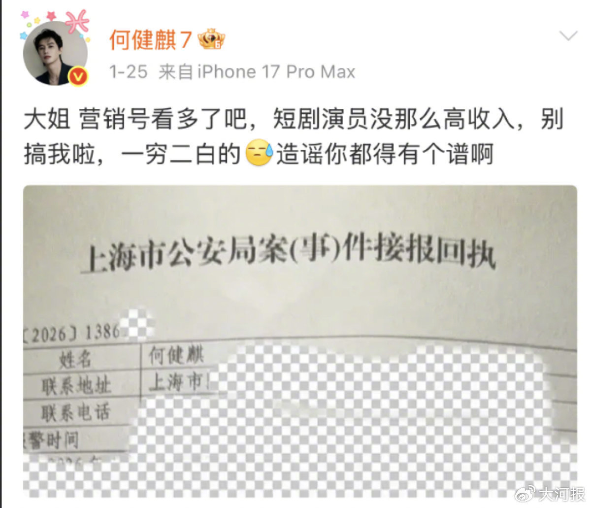 当日,何健麒回应称“大姐,营销号看多了吧,短剧演员没那么高收入,别搞我啦,一穷二白的,造谣你都得有个谱啊”。其工作室称已报案。